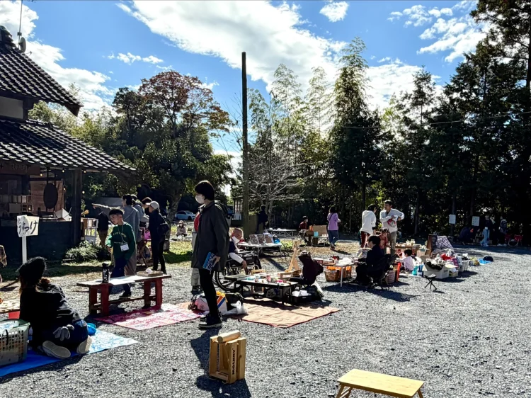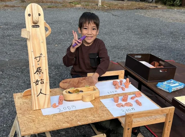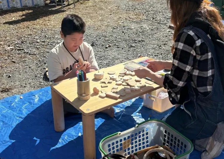 10時〜13時までが販売・体験タイム。自分で作ったものやいらなくなったおもちゃ、射的、手作り迷路ゲーム、似顔絵屋さん、オーラ鑑定、野菜詰め放題など、親子で考え、思い思いのお店を繰り広げてくれました。お互いのお店を訪ねるのも楽しそうでした。大人もそれぞれ体験できるお店を提供。焚き火でサツマイモを焼いたり、半紙に絵を描くワークショップ、多肉植物、藁細工体験、木工体験、保護猫活動啓発の紙芝居と盛りだくさんでした。