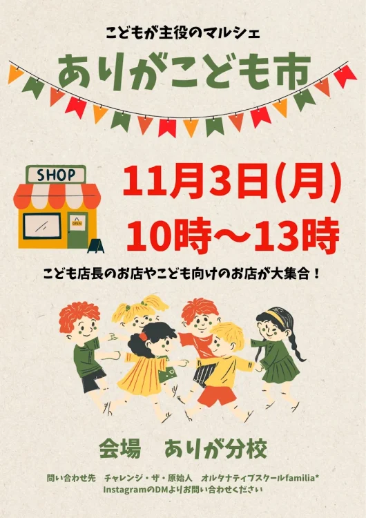 11月3日、秋晴れの文化の日、ありがこども市が初開催されました。企画は近隣の親子さん達。