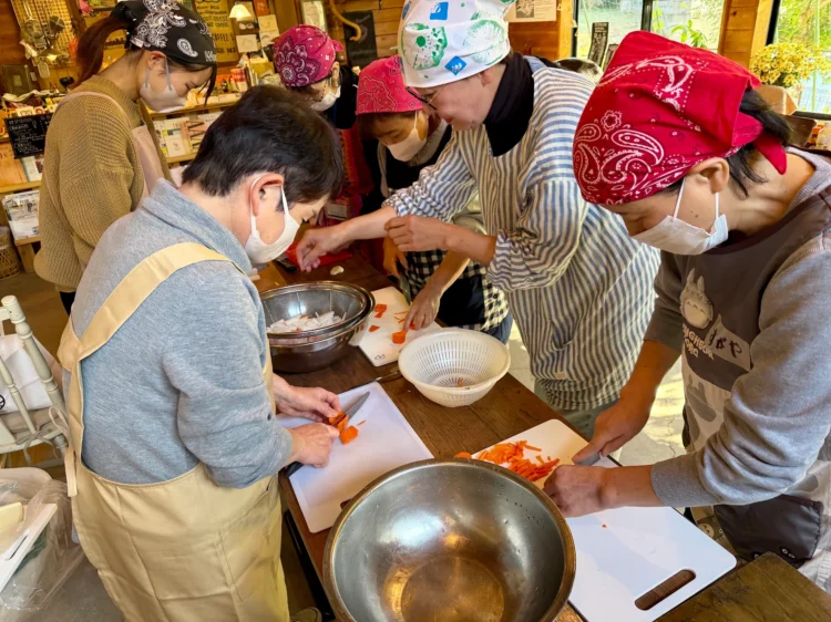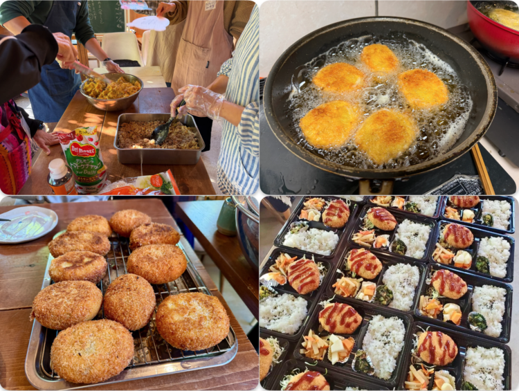 今回も8名のボランティアさんが来てくれて、大学生から80歳まで多世代の総勢10名で調理しました。かぼちゃやサツマイモ、里芋をミックスした特製コロッケ。心をひとつにしてみんなで作りました。