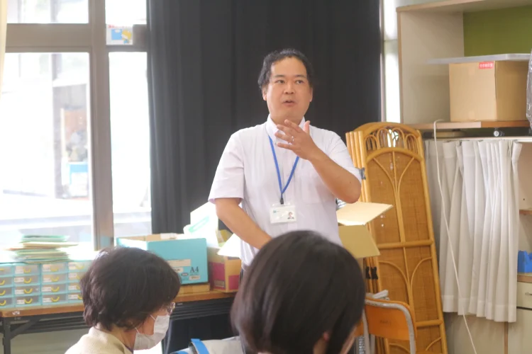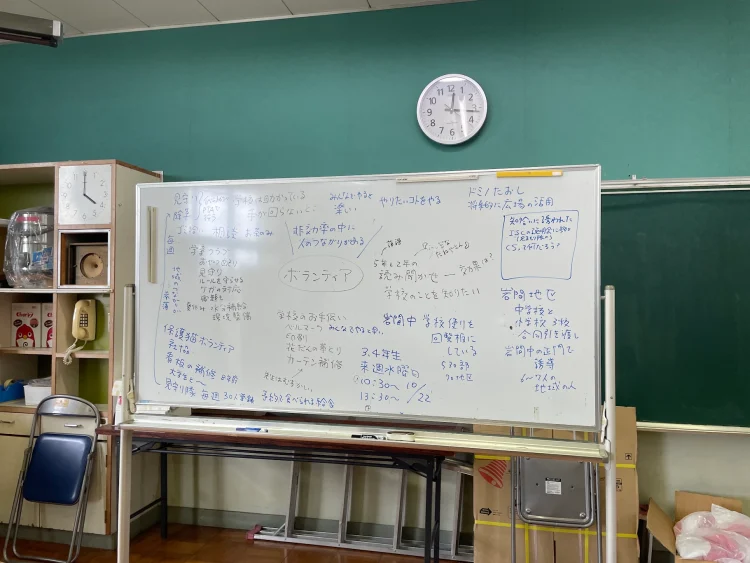 岩間第一小学校は一室をコミュニティルームとして、ボランティアさんの交流スペースになっており、見守りや除草、ゴミ拾いなどを担う地域の方が30名ほど登録しているISCというグループがあります。コミュニティスクール便りなど発信も担う塩畑さんが中心的に声をかけて、日々のコミュニケーションの中で育んできたネットワーク。その場所で、ちいセンをさせていただき、学ばせていただきました。