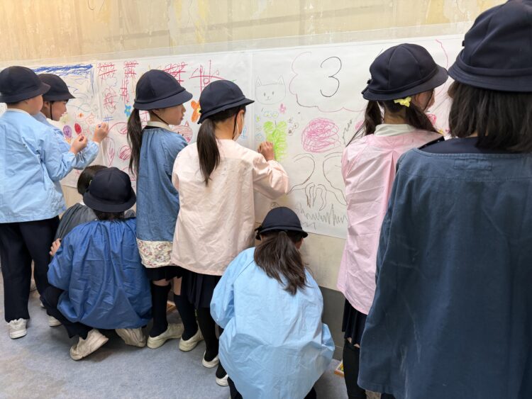 「落書き」では、3年生が三の丸キャンパスを訪れ、大きな模造紙やコンクリートの壁にクレヨンやチョークで自由に落書きを楽しみました。6年生はそのアテンドを行ったのですが、最初の3年1組でできなかったことを次の2組で修正し、最後の3組では余裕も感じられる運営で驚きました。
